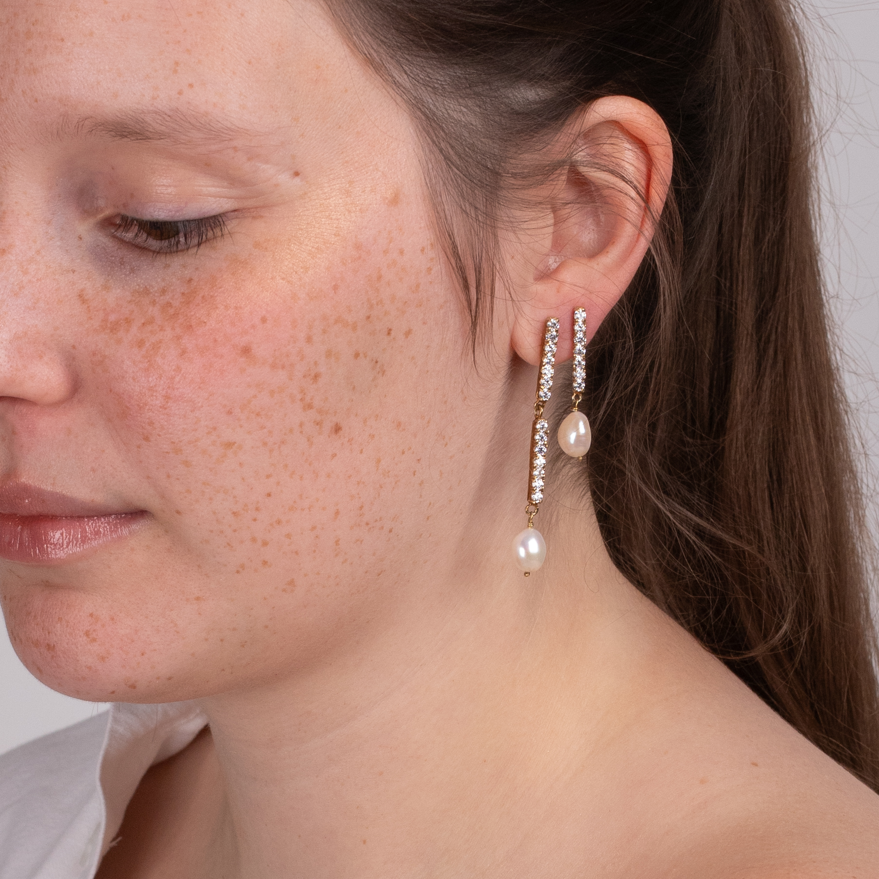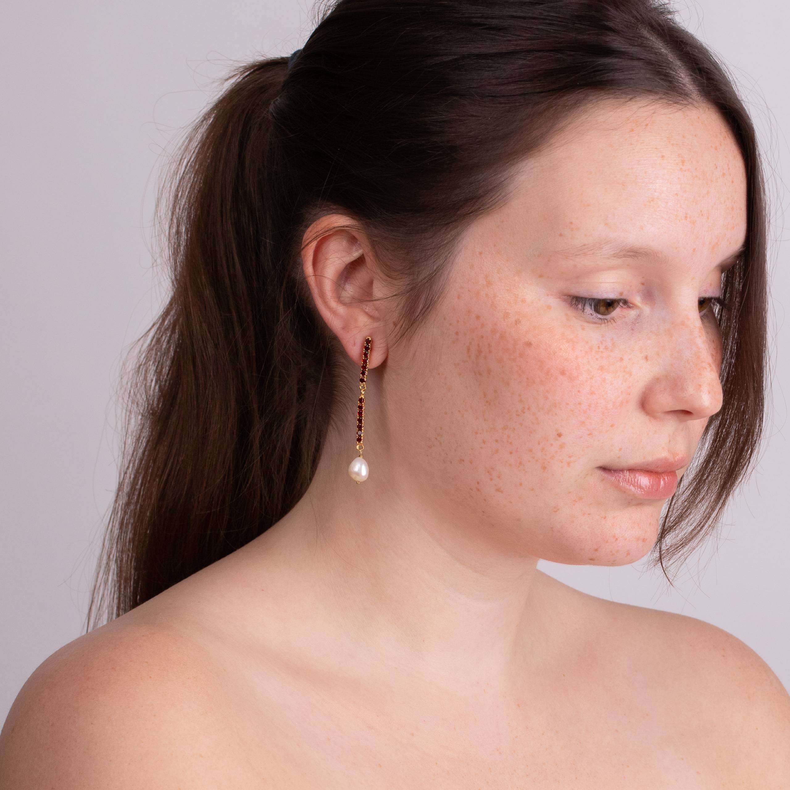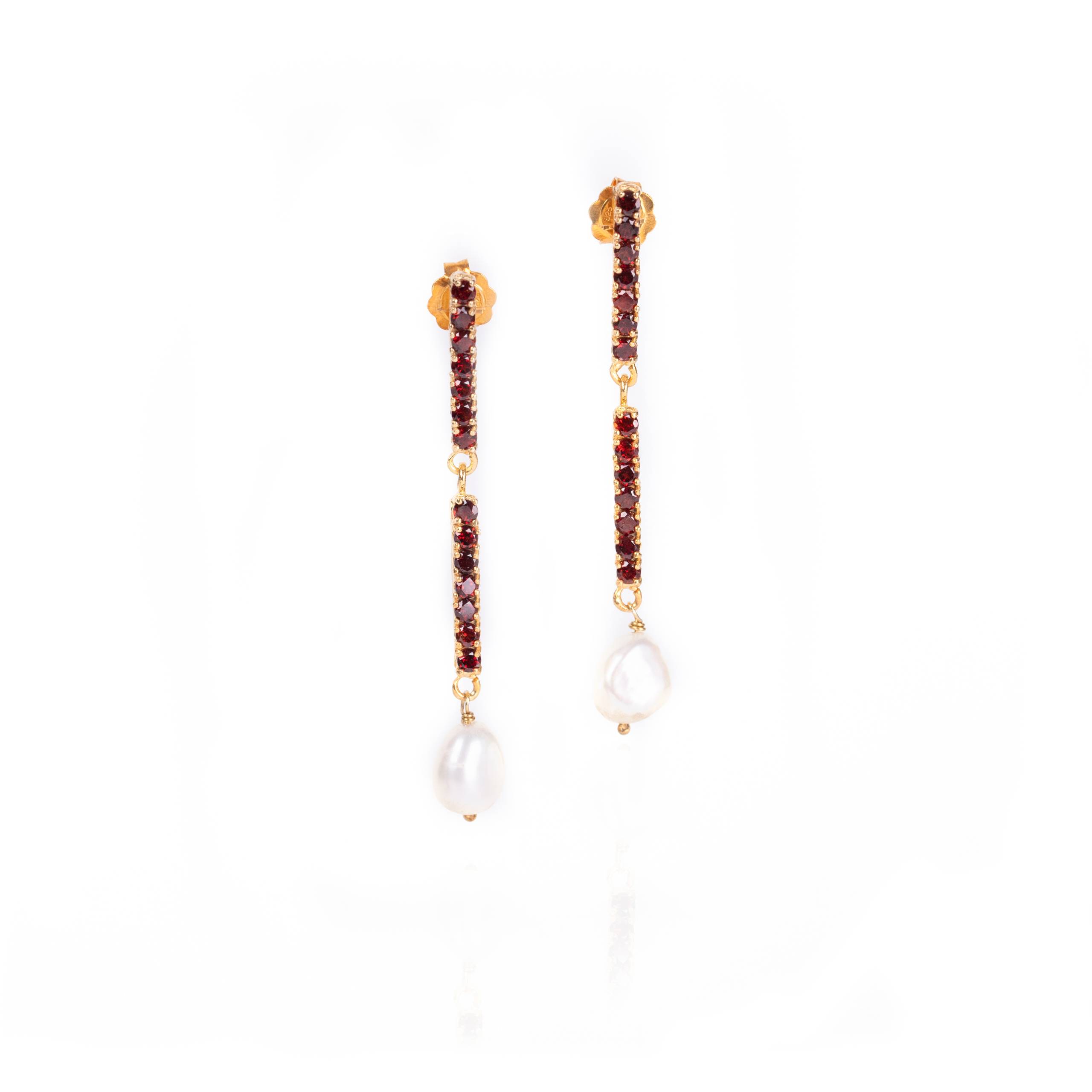 Brincos articulados eem prata plaqueada a ouro, pérolas barrocas e zircónias ou granadas